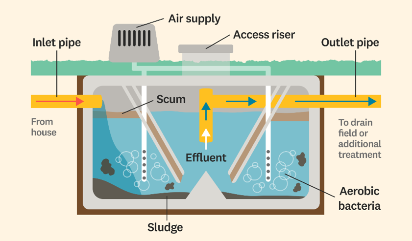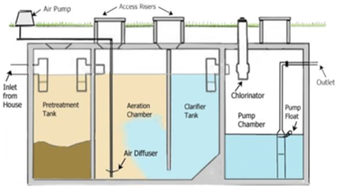 Aerobic Treatment Units (ATU) This type of ENR system treats household wastewater by using oxygen to support beneficial bacteria that break down waste more thoroughly than a conventional septic tank. Air is pumped into the system to keep the wastewater mixed and oxygen-rich, allowing the bacteria to reduce solids, odors, and harmful pollutants (at least 65%) before the water is released for further treatment or dispersal into the soil. ATUs are commonly used on smaller lots or in environmentally sensitive areas because they produce cleaner effluent and help protect groundwater and nearby water bodies. These systems require a maintenance contract and operating permit from the Health Department. |
