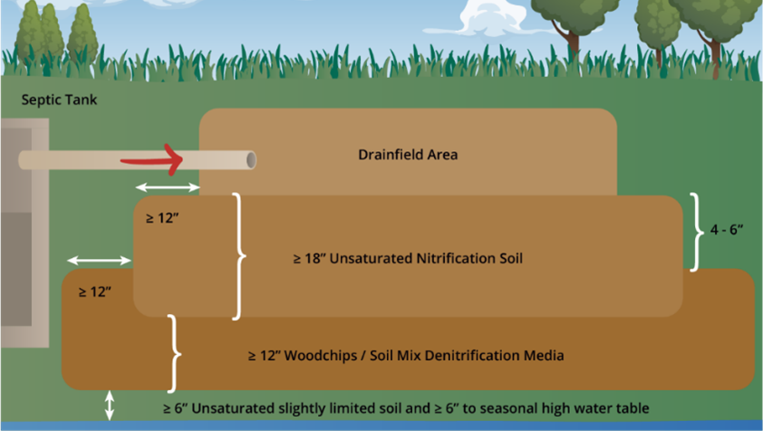 In-Ground Nitrogen-Reducing Biofilters (INRBs) This type of ENR system removes nitrogen, primarily in the form of nitrate, from wastewater or stormwater before it reaches groundwater or surface waters. Water passes through a buried, engineered media bed — typically sand or soil amended with a carbon source such as woodchips or compost — where naturally occurring denitrifying bacteria convert nitrate into harmless nitrogen gas under low-oxygen conditions. These systems are commonly used in nitrogen-sensitive areas, offering a passive, space-efficient approach to reducing nutrient pollution by 65% and protecting water quality. This system accommodates a larger drain field (so these won’t work on every site) and does not require a maintenance contract and operating permit. |