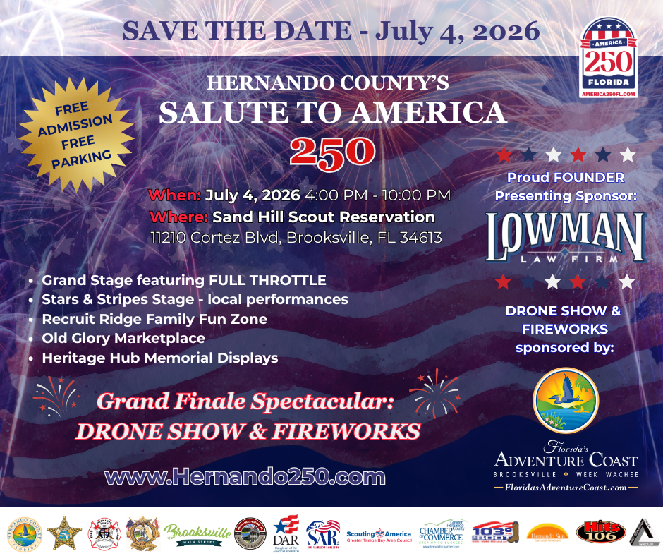 The Hernando County Salute to America 250 is made possible through an unprecedented coalition of government, civic, and private partners dedicated to honoring the nation's semiquincentennial. This historic event reflects the unified spirit of Florida’s Adventure Coast, blending heritage, service, and community celebration.