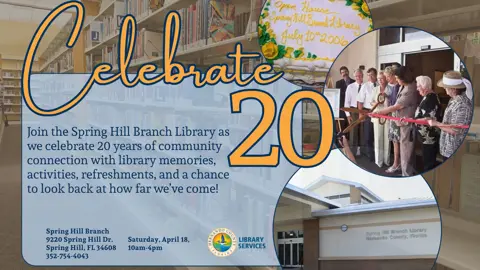 (Brooksville, FL) β The Hernando County Library System will celebrate the 20th anniversary of the Spring Hill Branch on Saturday, April 18, 2026, from 10:00 a.m. to 4:00 p.m.