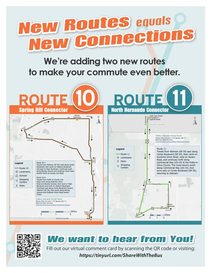 (Brooksville, FL) – Hernando County’s transit system, TheBus, is expanding service with the introduction of two new bus routes, Route 10 and Route 11, beginning May 4, 2026. These new routes are designed to increase access to key destinations and better serve residents throughout the region.